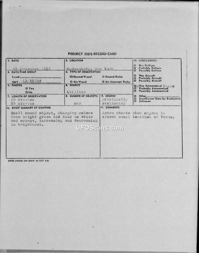 This document is a Project 10073 Record Card detailing a sighting that occurred on November 12, 1957, in Ogdensburg, New York. The observation, reported by a civilian source, involved a single, small, round object. The witness observed the object for a duration estimated between 10 and 25 minutes. The object was described as being practically stationary and exhibiting color changes, shifting between bright green, blue, white, and orange, while also fluctuating in brightness. The report indicates that no photographs were taken and no radar contact was made. The official conclusion reached by the evaluating agency, ATIC, was that the object was the planet Venus. This determination was supported by the observation that astronomical charts placed the object in the almost exact location of Venus at the time of the sighting.