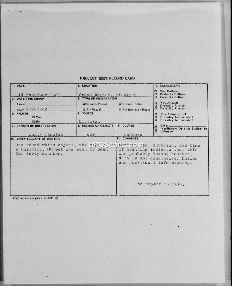 A 1957 sighting report from Grand Rapids, Michigan, describes a round, white object observed for forty minutes. The investigation concluded the object was likely Venus, though data was insufficient for a definitive identification.