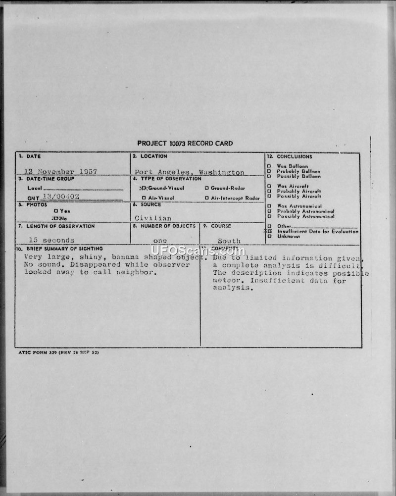 A 14-year-old civilian reported a large, banana-shaped object in Port Angeles, Washington, on 12 November 1957. Military authorities concluded the data was insufficient but suggested it may have been an H-21 helicopter.