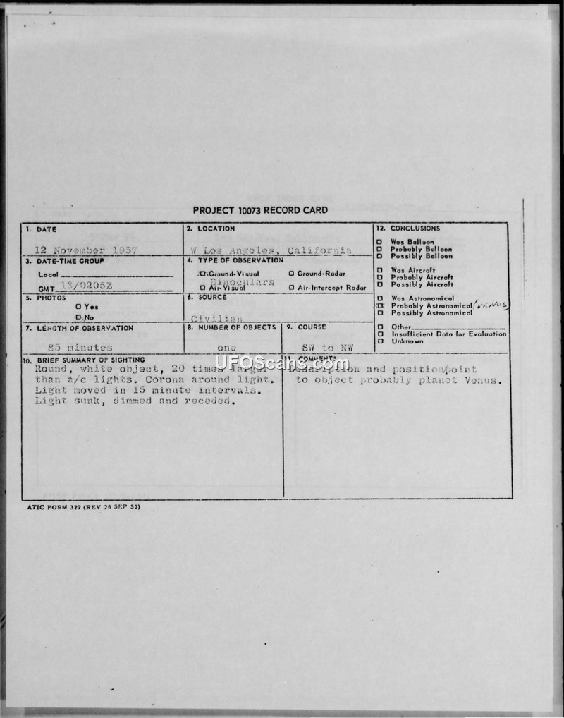 A 1957 sighting report of a round, white object in Los Angeles, which was officially concluded to be the planet Venus.