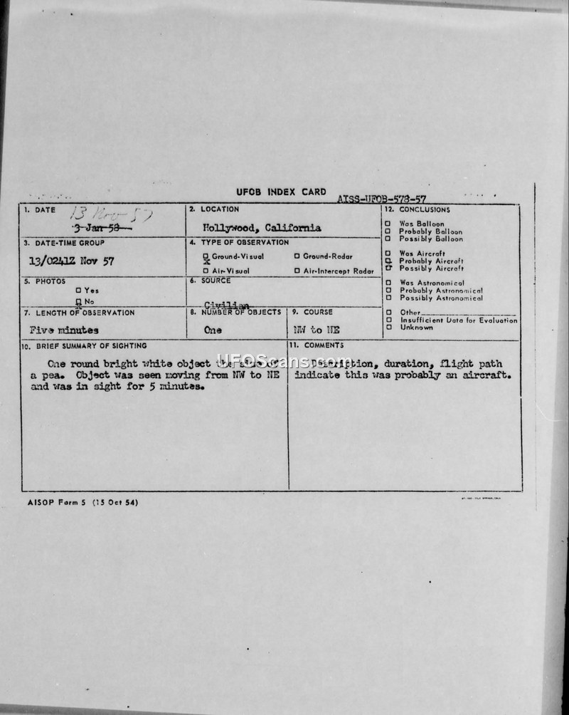 A 1957 sighting report from Hollywood, California, describing a round, white object observed for five minutes. The official conclusion identified the object as likely being an aircraft.