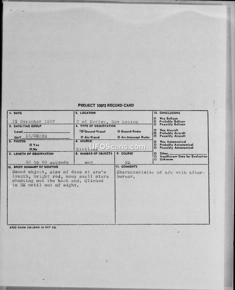 Project 10073 Record Card — 12 November 1957, Hurley, New Mexico