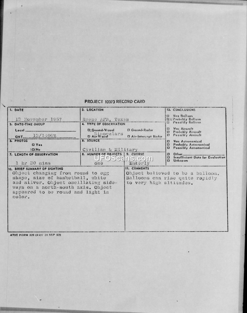 A 1957 sighting report from Reese AFB, Texas, describes a basketball-sized, oscillating object. The official conclusion identified the object as a balloon.