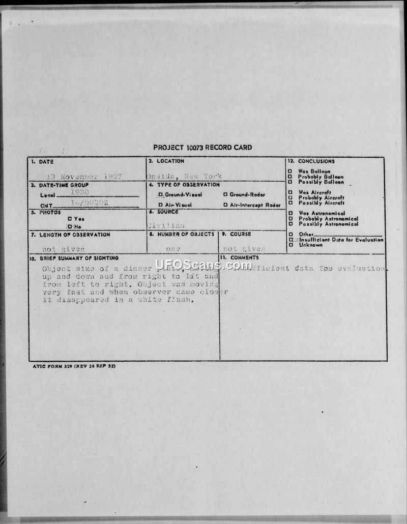 Project 10073 Record Card — Sighting of 13 November 1957, Oneida, New York