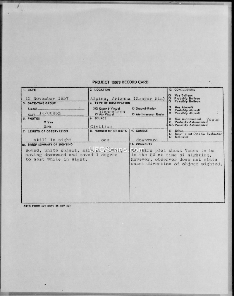 Project 10073 Record Card — Alpine, Arizona, 13 November 1957