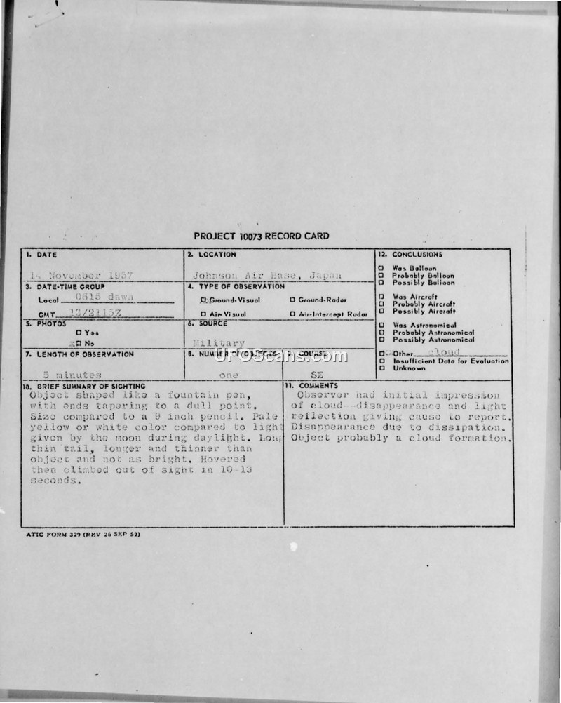 Project 10073 Record Card — Johnson Air Base, Japan, 14 November 1957