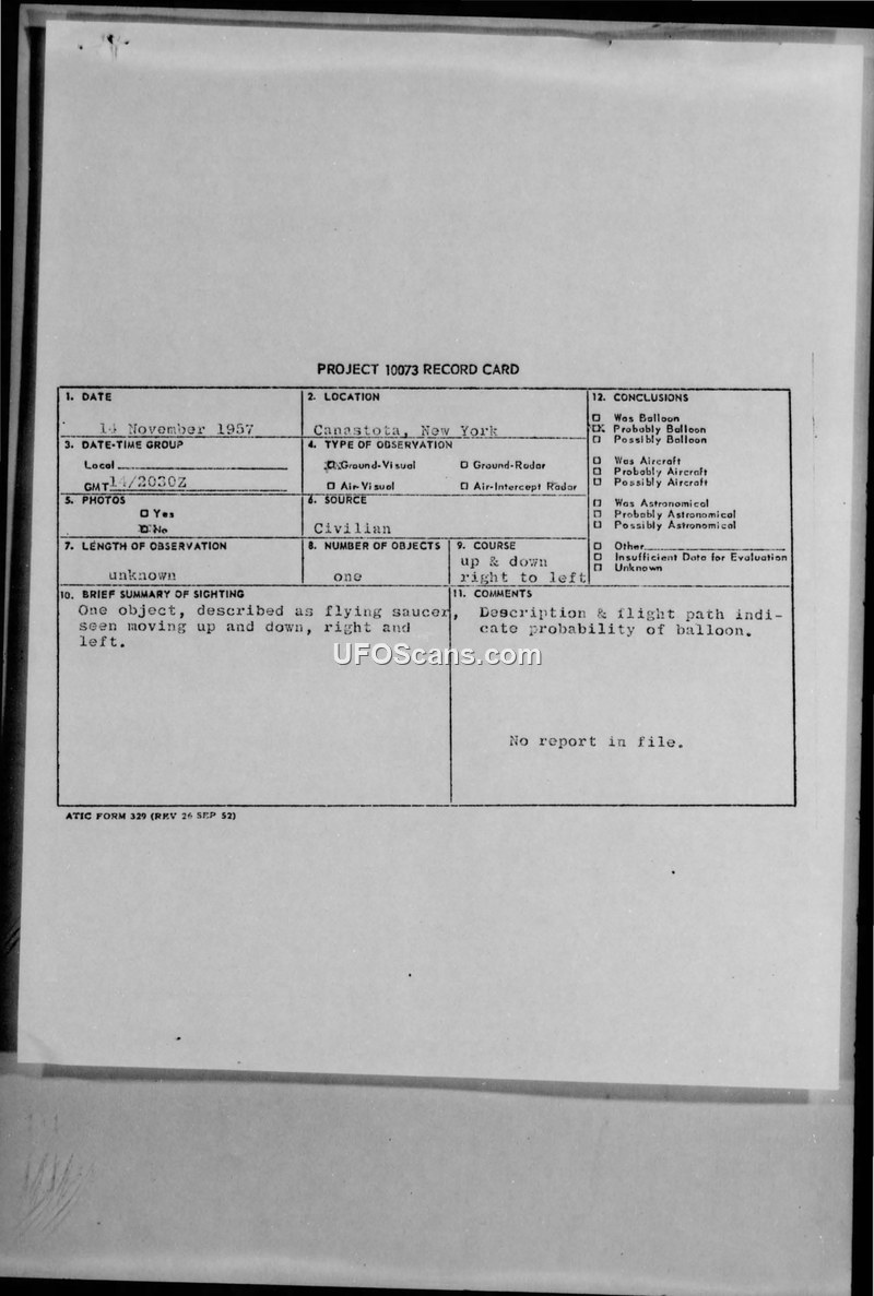 Project 10073 Record Card — Canastota, New York, 14 November 1957
