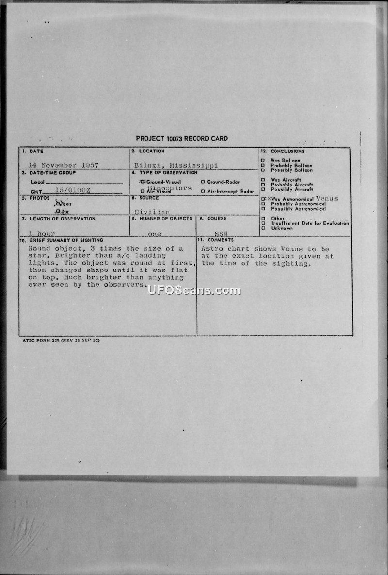 A 1957 sighting report from Biloxi, Mississippi, describes a bright, shape-shifting object identified by the Air Force as the planet Venus. The report includes multiple sketches and photographs, which were later dismissed by intelligence officers as artistic exaggerations.