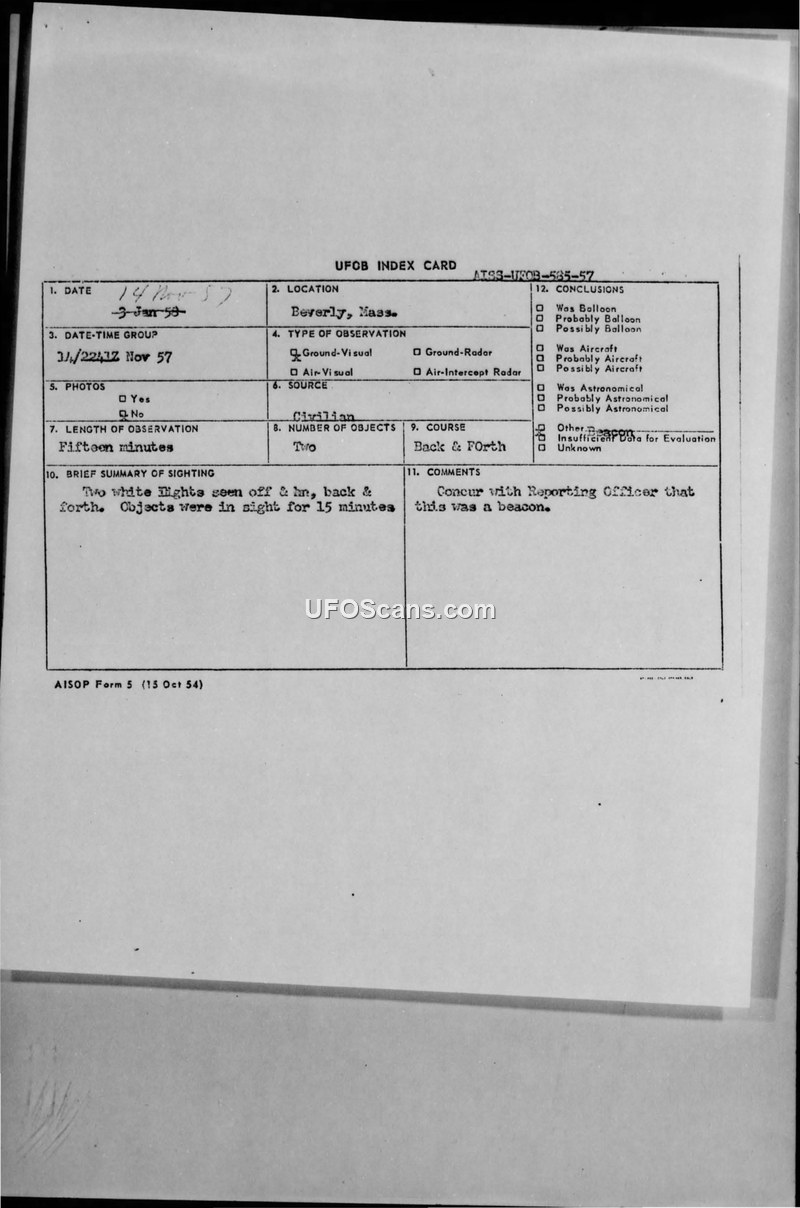 UFO Index Card and Associated Teletype — Beverly, Massachusetts, November 1957