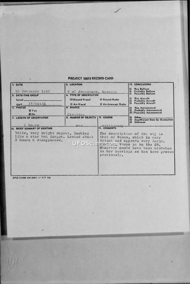 Project 10073 Record Card — Jonesboro, Georgia, 16 November 1957