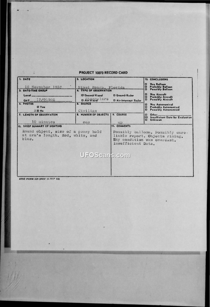 A Project 10073 record card documenting a 10-minute sighting of a rising, multi-colored round object in Miami Beach on 16 November 1957. The report was ultimately classified as having insufficient data for evaluation.