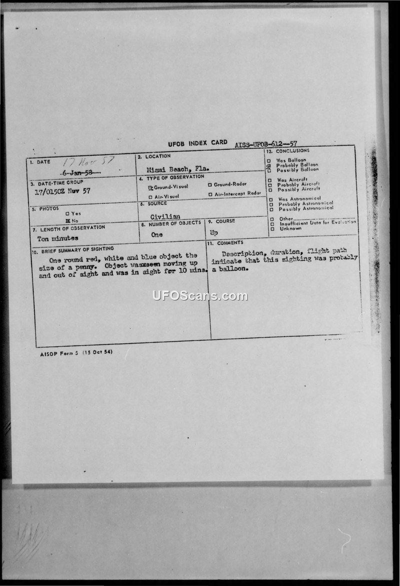 UFOB Index Cards and Reports — November 1957