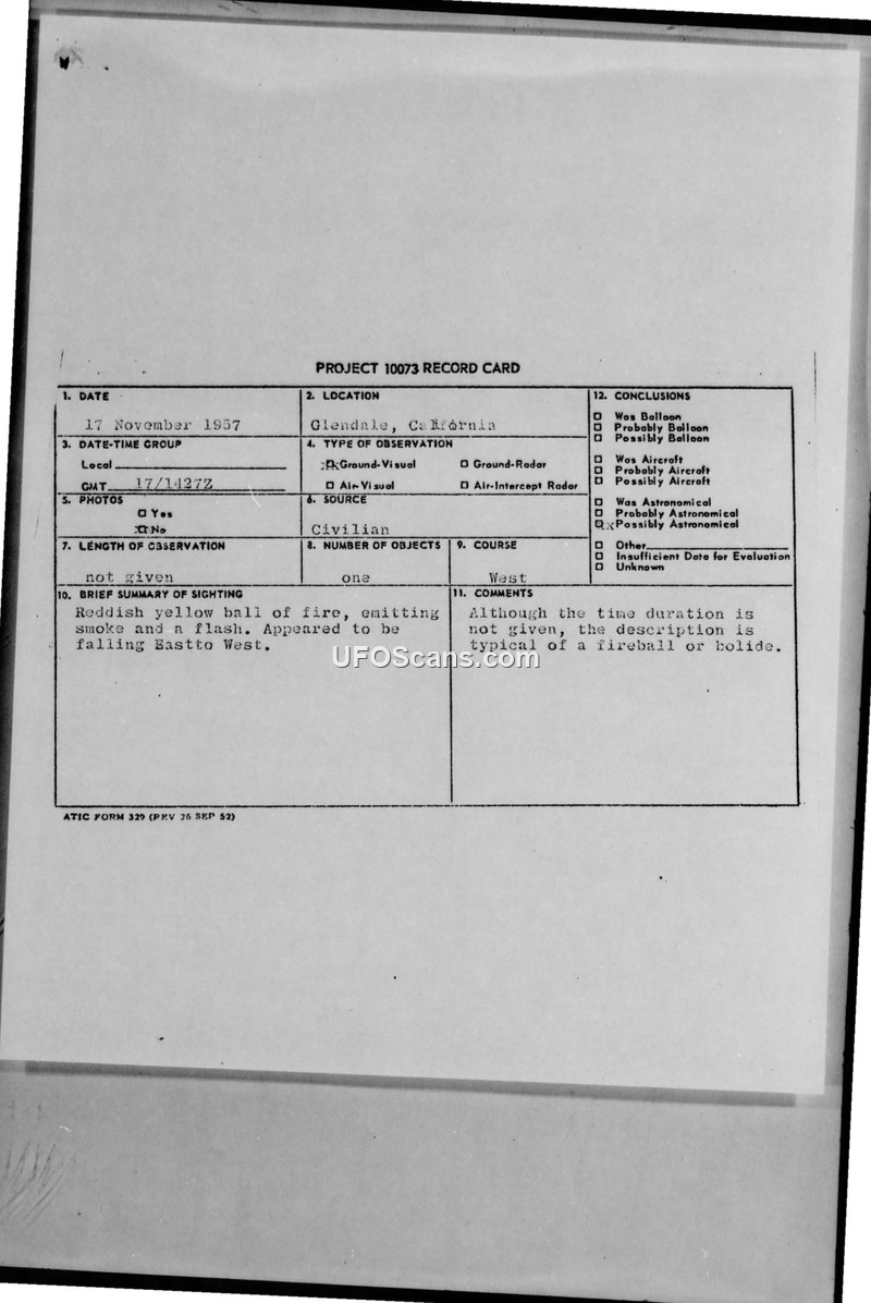 A police officer in Glendale, California, reported a fireball on November 17, 1957. Military intelligence evaluated the report and concluded the object was likely a meteor or bolide.