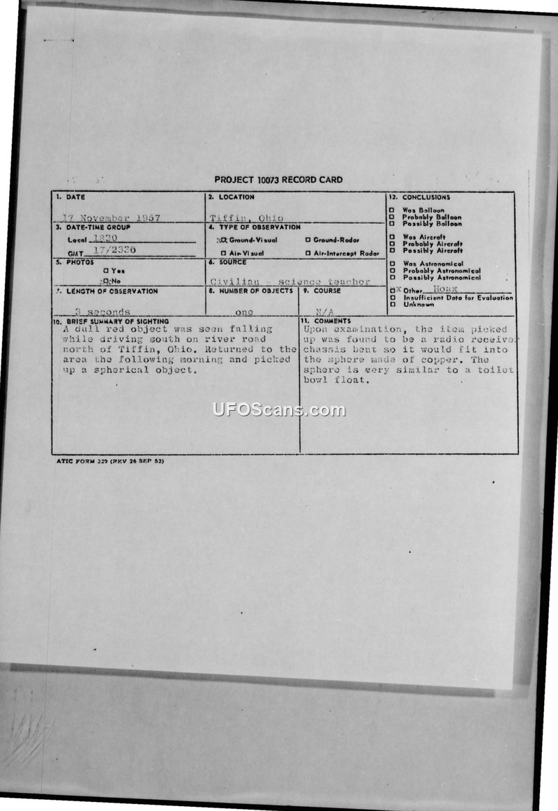 Project 10073 Record Card — Tiffin, Ohio, 17 November 1957