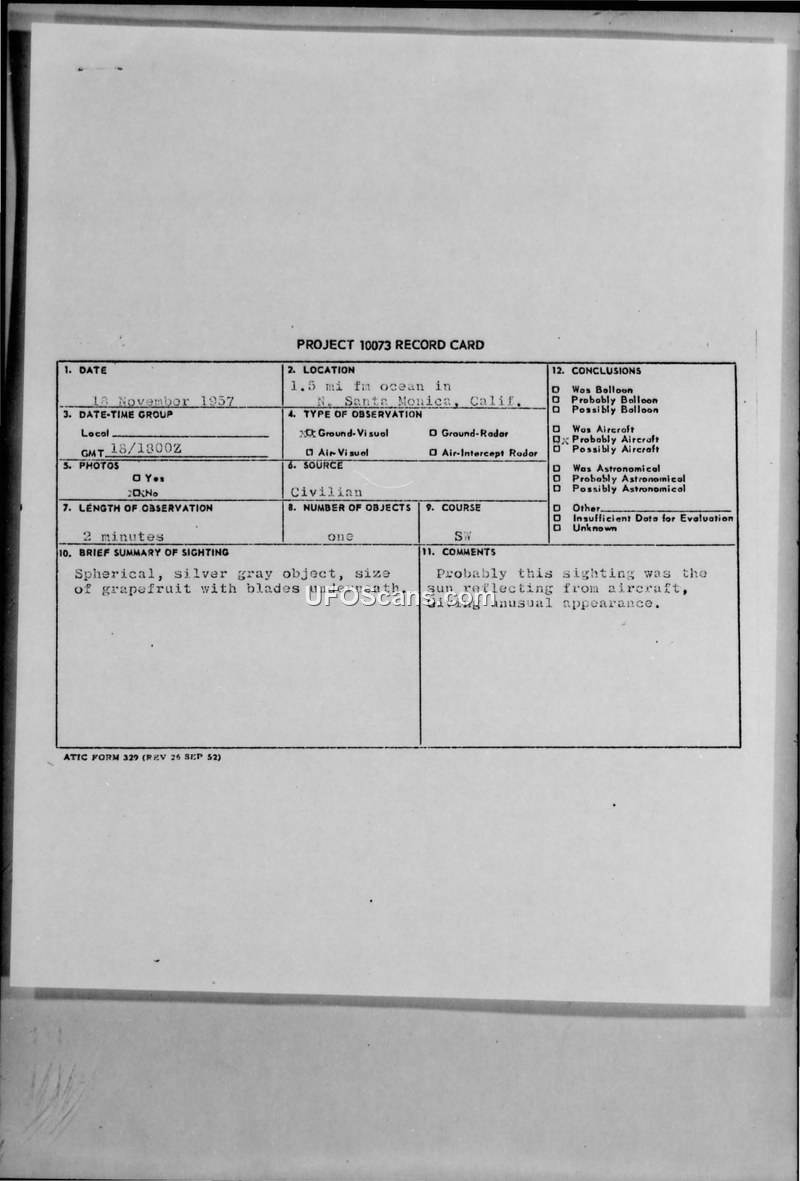 A civilian reported a spherical, silver-gray object with blades in North Santa Monica on November 18, 1957. Military investigators concluded the object was likely a sun reflection off a circling aircraft.