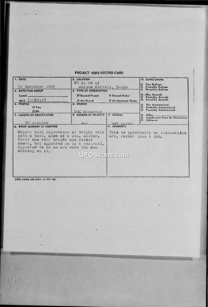 Project 10073 Record Card — 19 November 1957, Corpus Christi, Texas