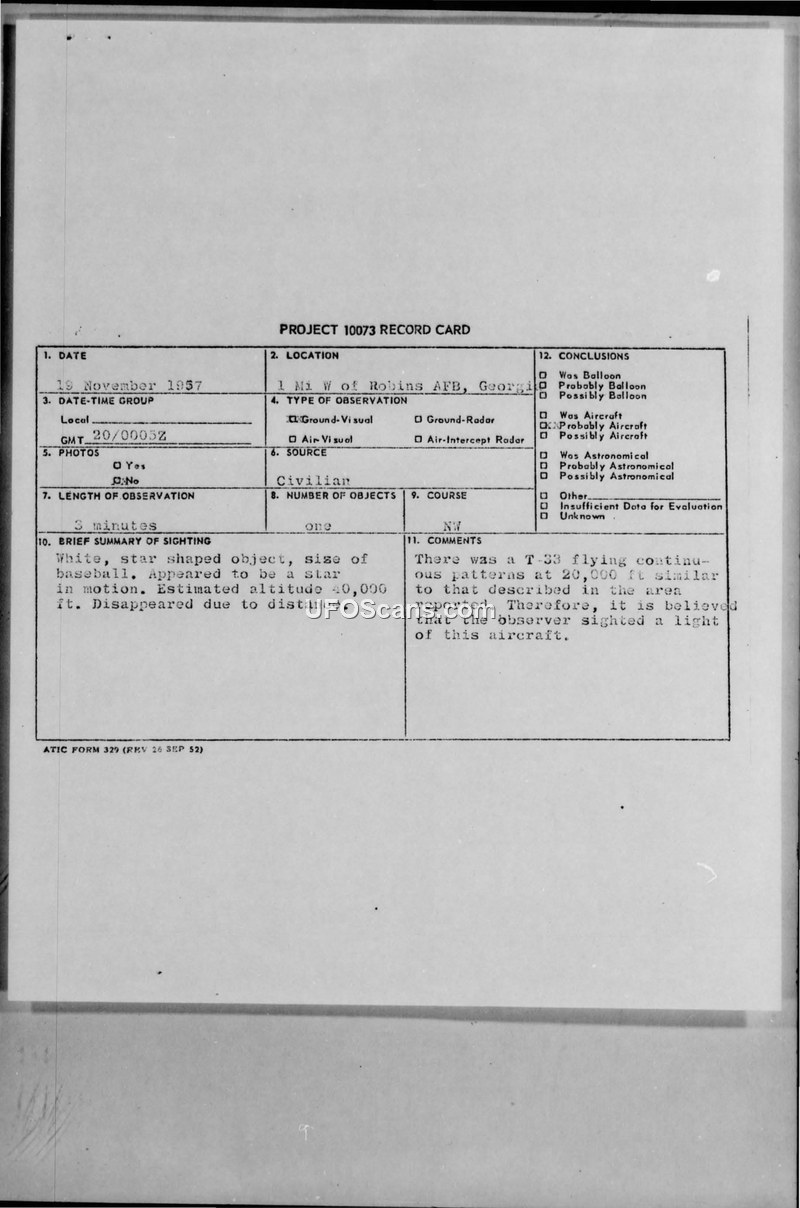 A civilian sighting of a star-shaped object near Robins AFB on 19 November 1957 was investigated by Major John W. Porter. The incident was officially attributed to a T-33 aircraft flying in the vicinity.