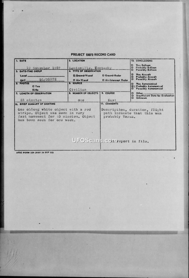 Two Project 10073 record cards document civilian UFO sightings in Louisville, Kentucky, in November 1957. Both incidents were officially attributed to astronomical phenomena, specifically Venus and a star.