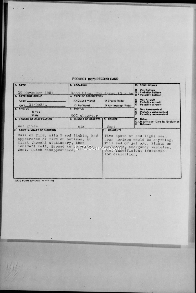 A GOC observer reported a ball of fire with five red lights over Wood Glen, NJ, on November 20, 1957. The ATIC concluded the report contained insufficient data for a definitive identification.