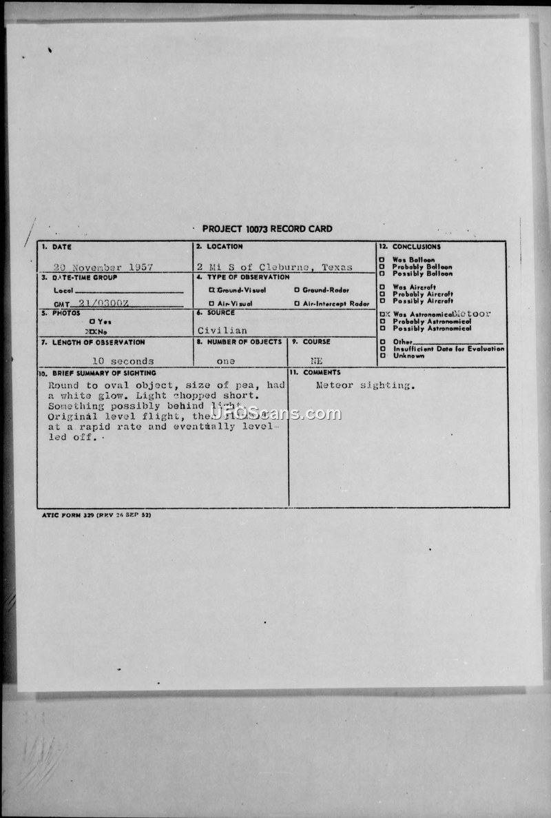 Project 10073 Record Card: Sighting near Cleburne, Texas, 20 November 1957