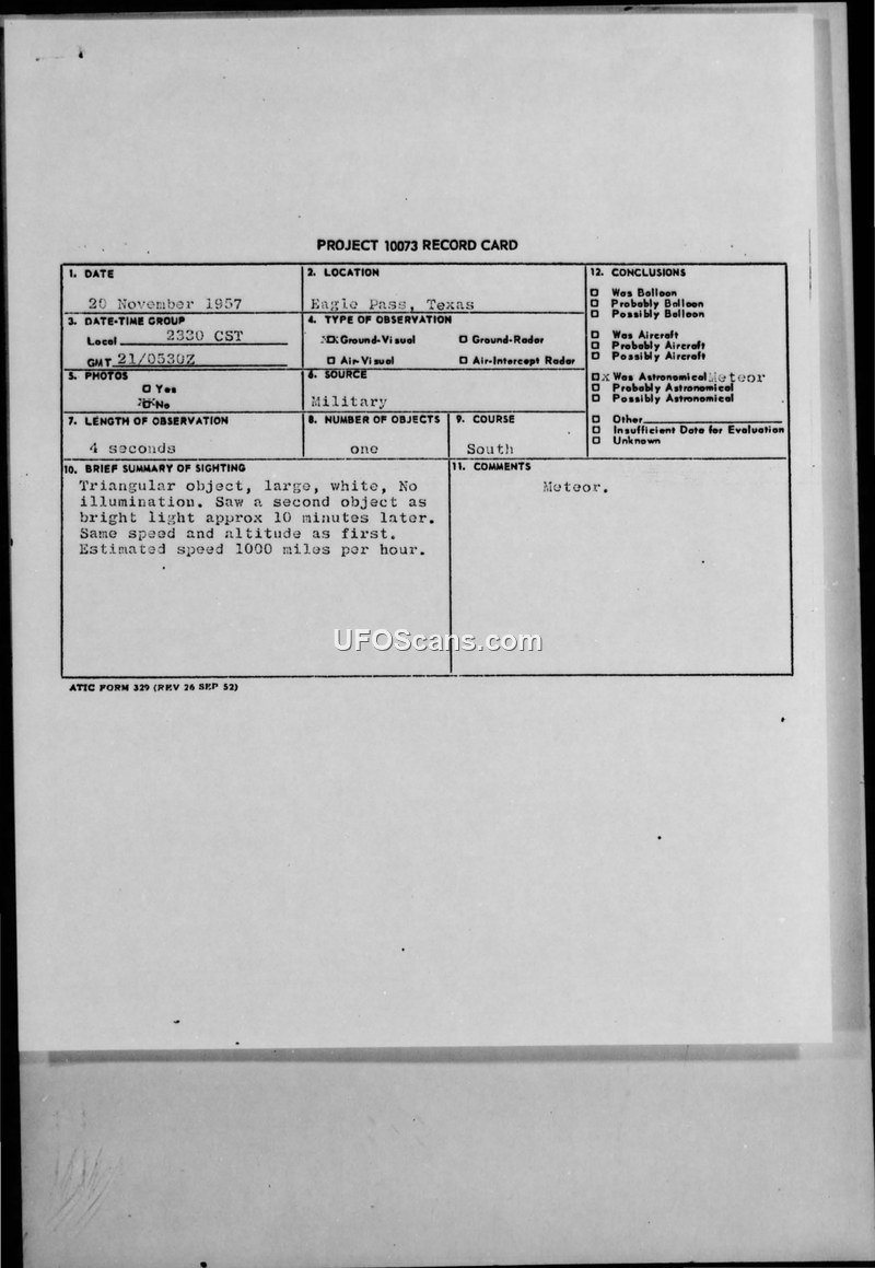 On November 20, 1957, at approximately 2330 CST, an unidentified aerial object was observed over Eagle Pass, Texas. The witness, identified as an Air Force veteran, reported seeing a large, white, triangular object moving south. The object, which displayed no illumination, was estimated to be traveling at a speed exceeding 1,000 miles per hour at an altitude between 10,000 and 20,000 feet. The duration of the sighting was approximately four seconds. The witness further reported observing a second object, described as a bright light, approximately ten minutes later, which maintained the same speed and altitude as the first. The weather conditions at the time were clear with no moon, though a low overcast with a ceiling of approximately 3,000 feet developed over the city immediately following the passage of the object. The reporting officer, Captain Frederick M. Diener of the 733 ACWRON, noted that the observer was calm and of sober disposition, though the officer characterized the report itself as 'very poor.' The official conclusion recorded on the Project 10073 record card identifies the phenomenon as a meteor. The witness, who had served during the war, stated this was his second UFO report.