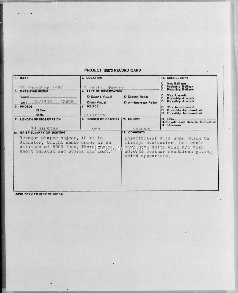 A Turkish Air Force pilot reported a hexagonal object in November 1957. US Air Attache investigators concluded there was insufficient data to identify the object, suggesting it may have been a delta-wing aircraft distorted by weather.