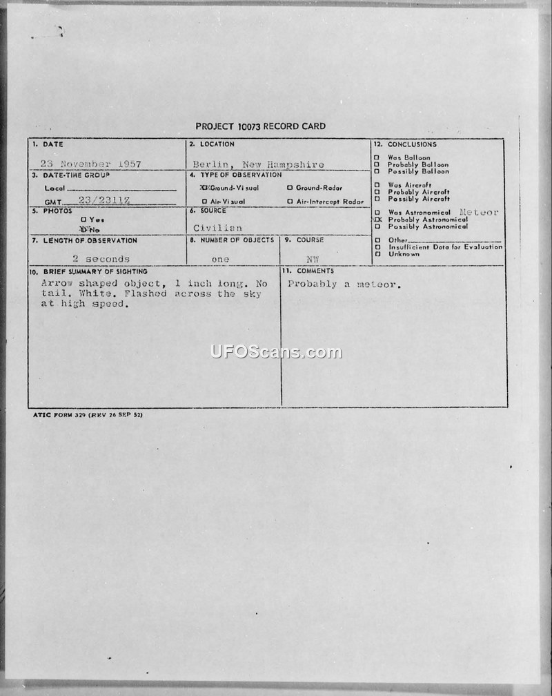 PROJECT 10073 RECORD CARD - Berlin, New Hampshire, 23 November 1957