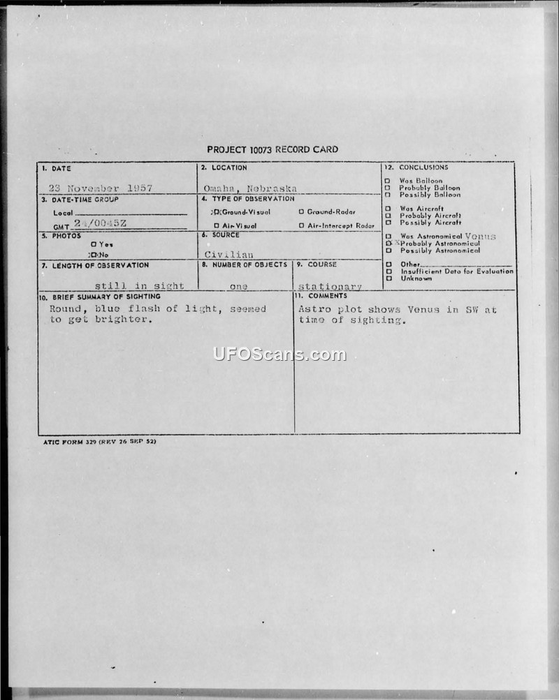 Project 10073 Record Card and Incident Report — Omaha, Nebraska, November 1957