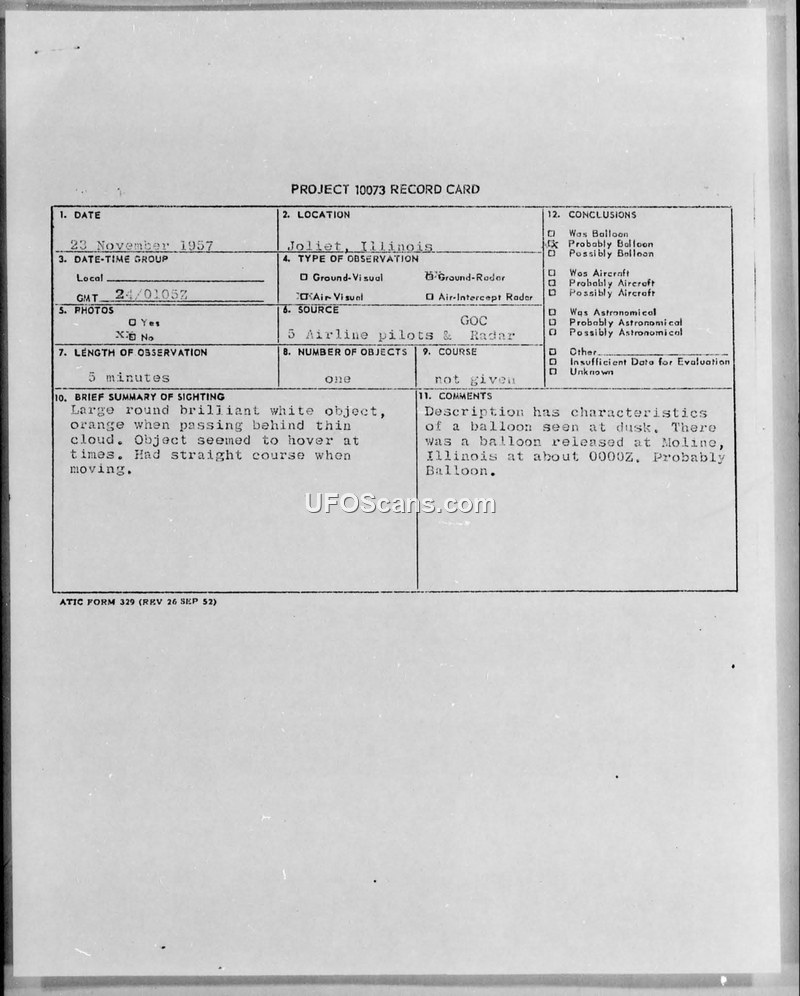 Five commercial airline pilots reported a brilliant white object near Joliet, Illinois, on November 23, 1957, which was also tracked by radar. Military investigators concluded the object was likely a weather balloon released from Moline, Illinois.