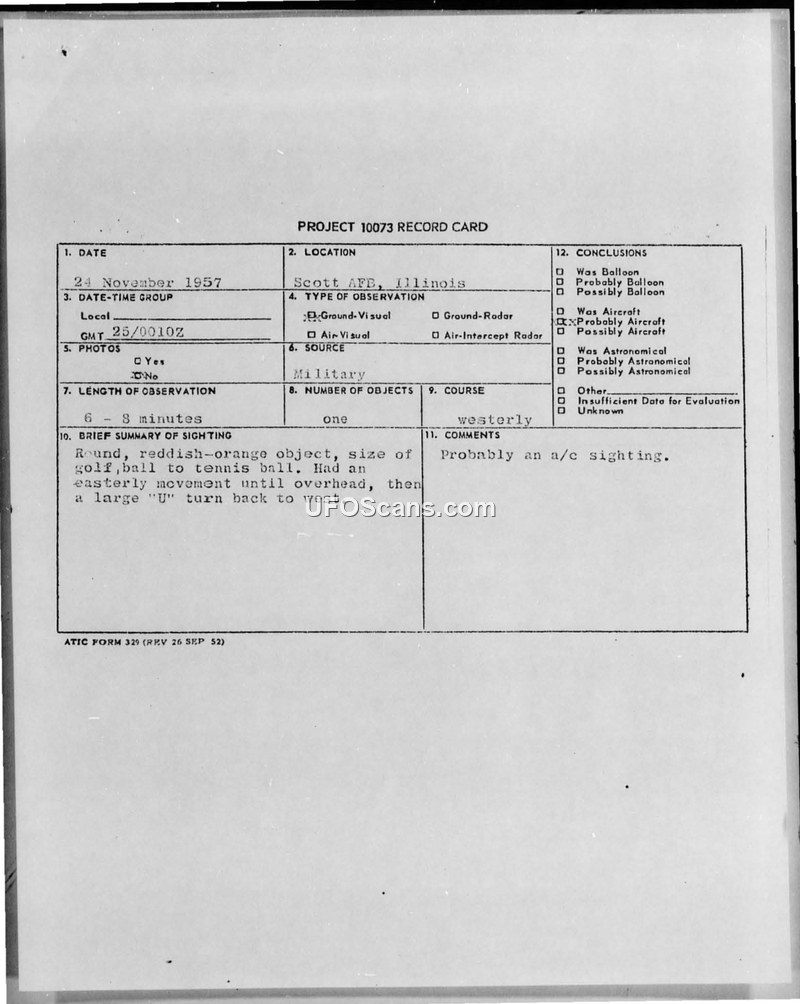 Report of Sighting of Unidentified Flying Object (UFOB) — Scott Air Force Base, 25 November 1957