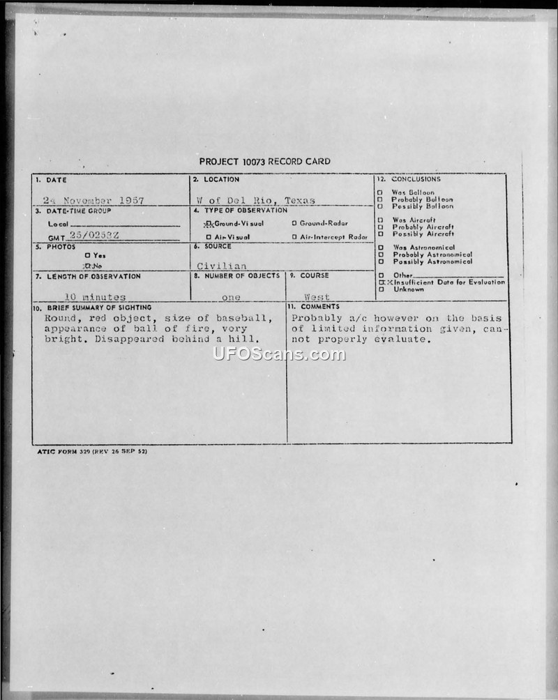 Project 10073 Record Card — Del Rio, Texas, 24 November 1957
