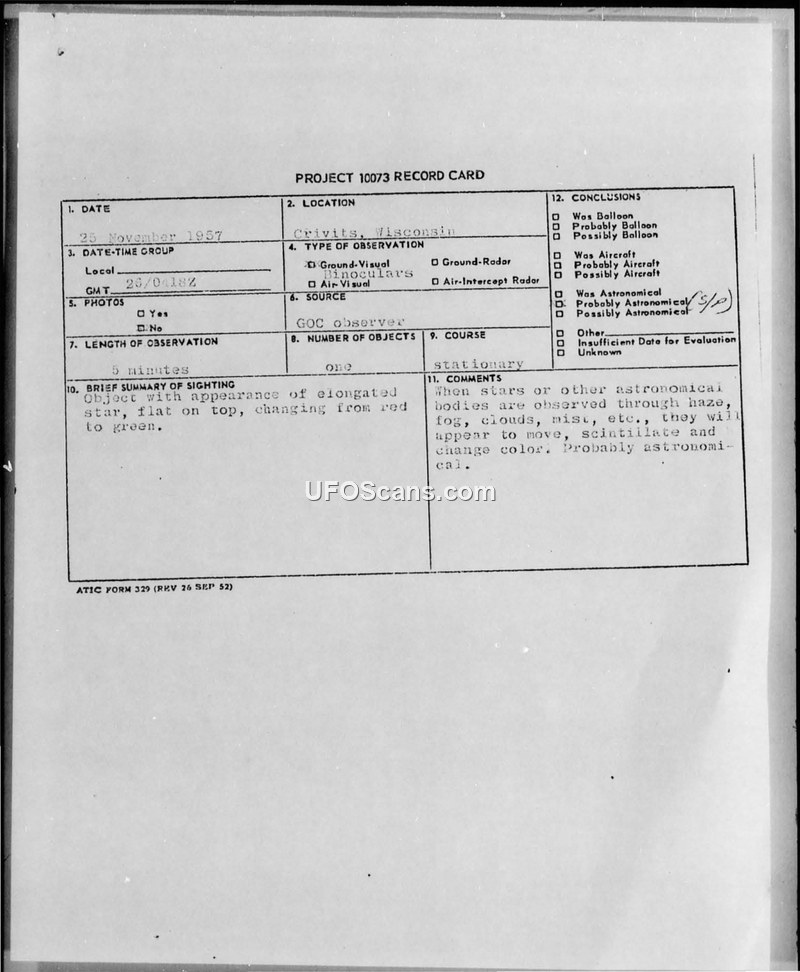 PROJECT 10073 RECORD CARD - Crivits, Wisconsin - 25 November 1957