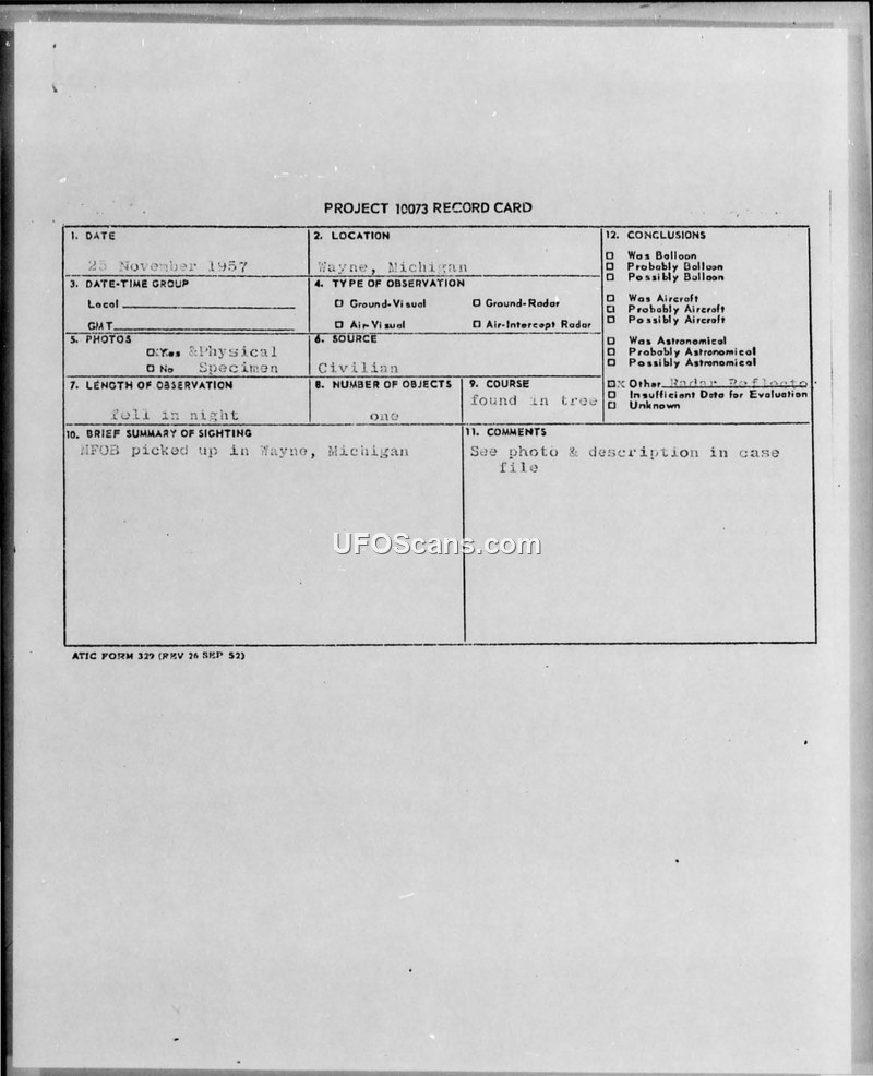 A suspected UFO found in Wayne, Michigan, in 1957 was identified by the Air Force as a standard radar-target reflector used for weather balloons. The military considered using the incident to publicly discount other UFO reports.