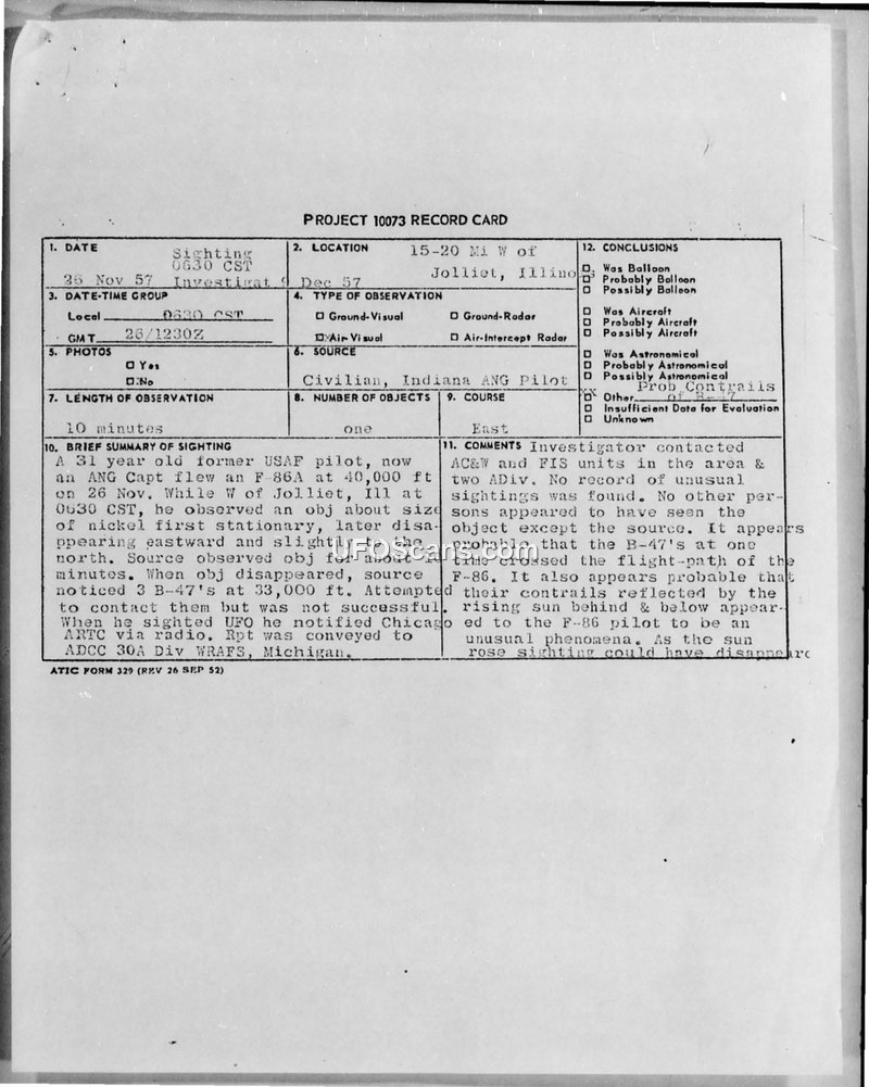 Project 10073 Record Card — 26 November 1957 Sighting, Joliet, Illinois
