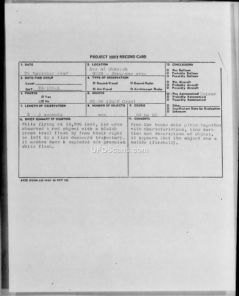 A USAF air crew observed a red, bluish-green object over the Sea of Okhotsk on November 26, 1957, which exploded in flight. The Fifth Air Force officially concluded the object was a meteor (bolide).