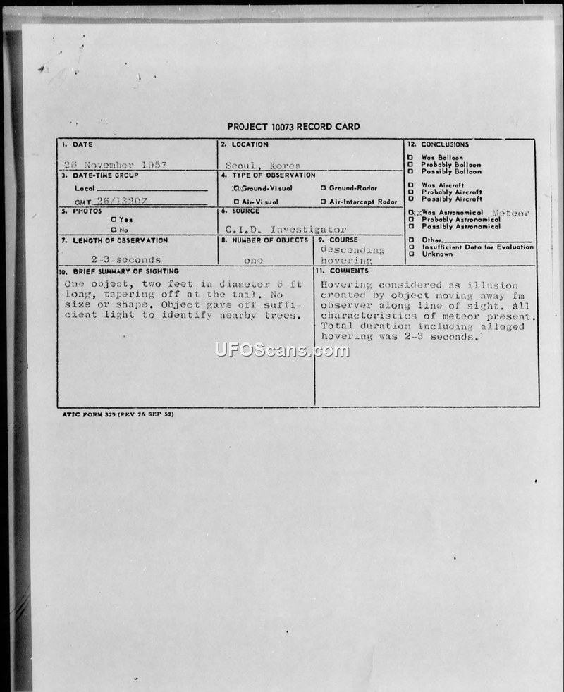 Project 10073 Record Card — Seoul, Korea, 26 November 1957