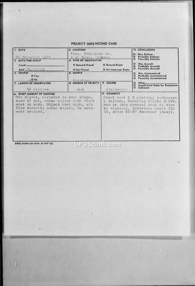 This document is a Project 10073 record card detailing an Unidentified Aerial Phenomena (UAP) sighting that occurred on November 26, 1957, near the north end of Chocolate Mountain in Arizona. The sighting was reported by two military personnel, LT E.V. Laney of the US Navy and 1/LT L.E. Vosburgh of the USAF. The witnesses observed a single object for approximately 20 minutes. The object was described as circular to pear-shaped, silver in color, with a black spot on its side, and was estimated to be the size of a pea at a very high altitude. The object remained stationary throughout the observation, and no movement was noticed. The report notes that an aircraft flew directly under the object. Following the report, an investigation was conducted by the 864th ACWRON. By cross-referencing weather plotting charts and flight data, the investigators determined that the object was a high-altitude balloon associated with Vernalis flight S-372. The document includes a teletype message from the 864th ACWRON to various commands, including the Air Technical Intelligence Center at Wright-Patterson Air Force Base, confirming the identification of the object as a Sky Hook type balloon. The report concludes that the sighting was explained.