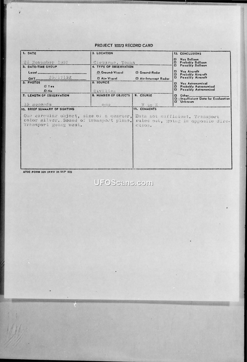 A GOC spotter in Cleburne, Texas, reported a circular, silver object on 26 November 1957. Official records list the case as having insufficient data, though handwritten notes suggest it was likely a sun reflection off a transport aircraft.