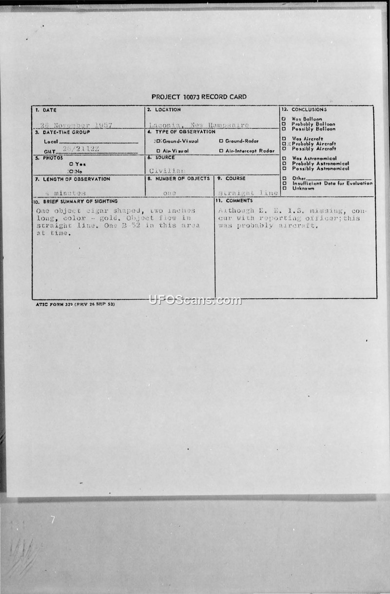 A 1957 sighting report from Laconia, New Hampshire, describes a gold, cigar-shaped object. The official conclusion identifies the object as likely being an aircraft, noting the presence of a B-52 in the vicinity.