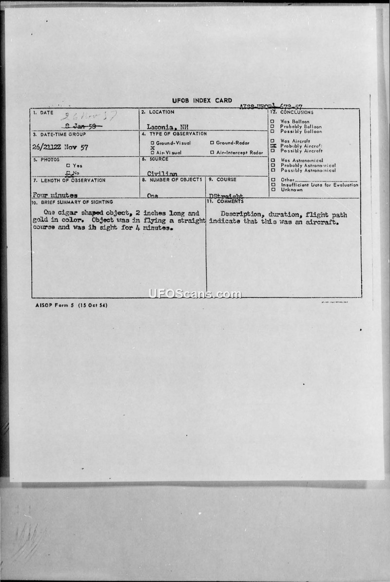 UFOB Index Card and Intelligence Report — Laconia, NH, November 1957