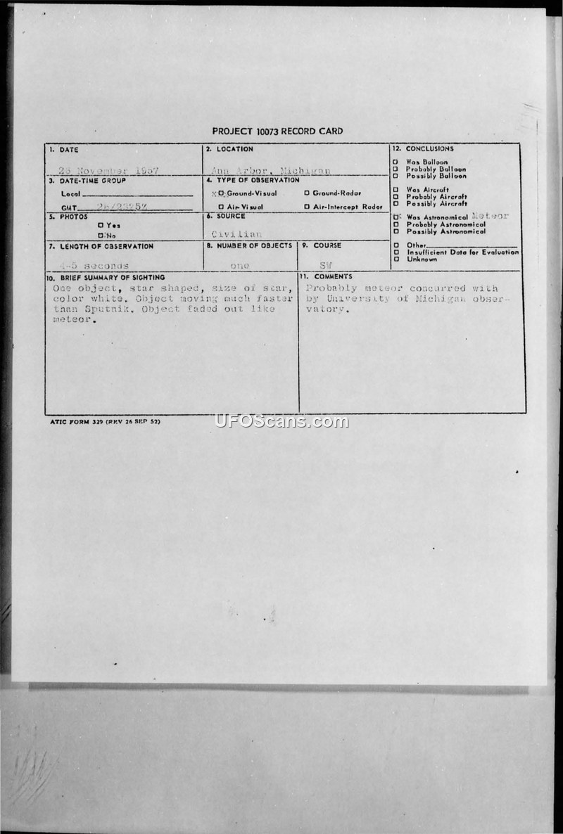 A 1957 sighting of a star-shaped object in Ann Arbor, Michigan, was investigated by the Air Technical Intelligence Center. The University of Michigan Observatory concluded the object was likely a meteor.