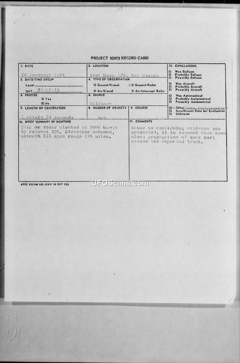 A radar sighting at West Mesa AFS on 26 November 1957 recorded an object moving at 3000 knots. The military concluded the track was caused by anomalous propagation.