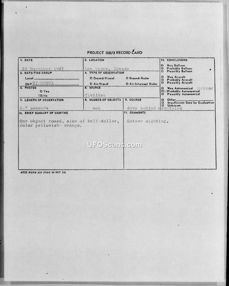 A civilian in Las Vegas reported a yellowish-orange, round object on 26 November 1957. The sighting lasted 5-7 seconds and was officially classified as a meteor.
