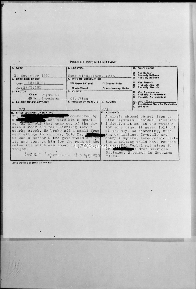 Project 10073 Record Card — Middletown, Ohio, 27 November 1957