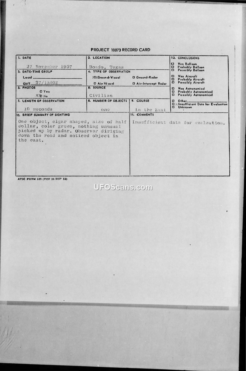 A civilian in Hondo, Texas, reported a 10-second sighting of a green, cigar-shaped object on November 27, 1957. Military radar confirmed no unusual activity, and the case was closed as having insufficient data.