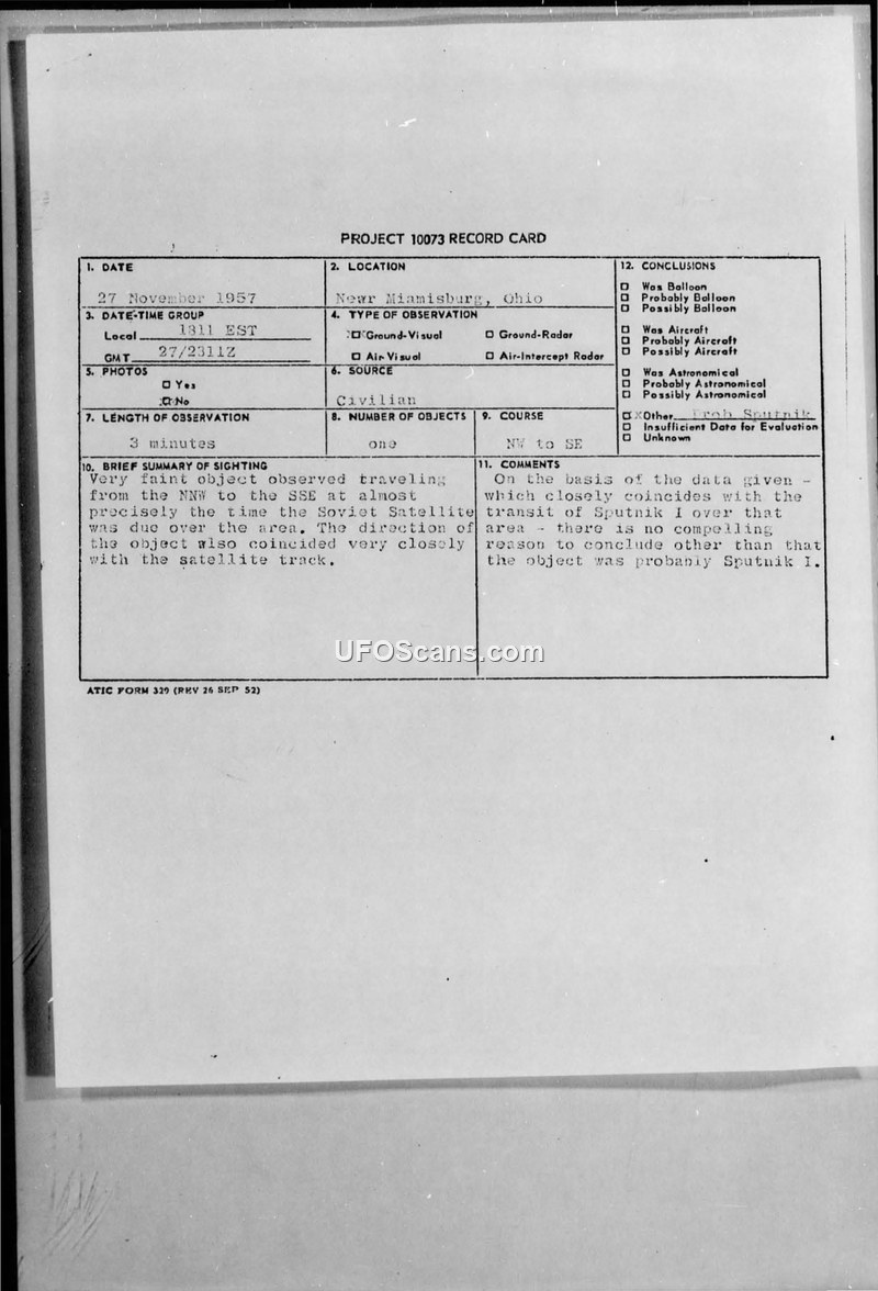 A 1957 sighting report from Miamisburg, Ohio, was investigated by the Air Technical Intelligence Center. The object was officially identified as the Soviet satellite Sputnik I based on orbital data.