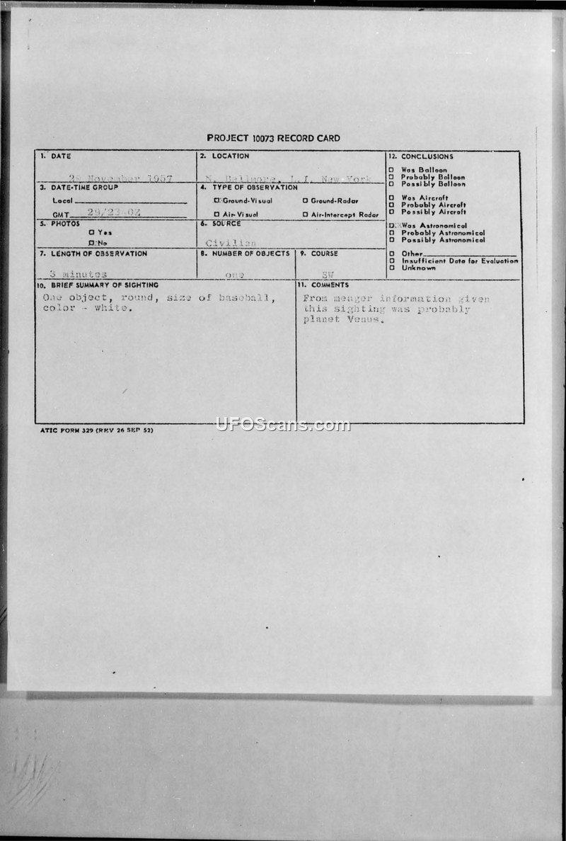 A 1957 sighting report from North Bellmore, New York, describes a single white, round object. The Air Technical Intelligence Center concluded the object was likely the planet Venus.