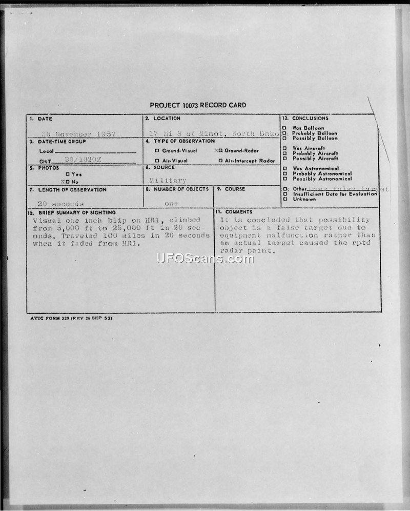 Project 10073 Record Card — 17 Mi S of Minot, North Dakota, 30 November 1957