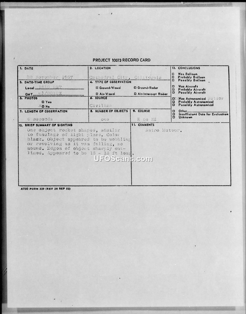 Two witnesses in Cathedral City, California, reported seeing a black, rocket-shaped object on November 30, 1957. Air Force investigators concluded there was insufficient data to identify the object, noting the witnesses' potential bias due to contemporary news reports about the Sputnik rocket.