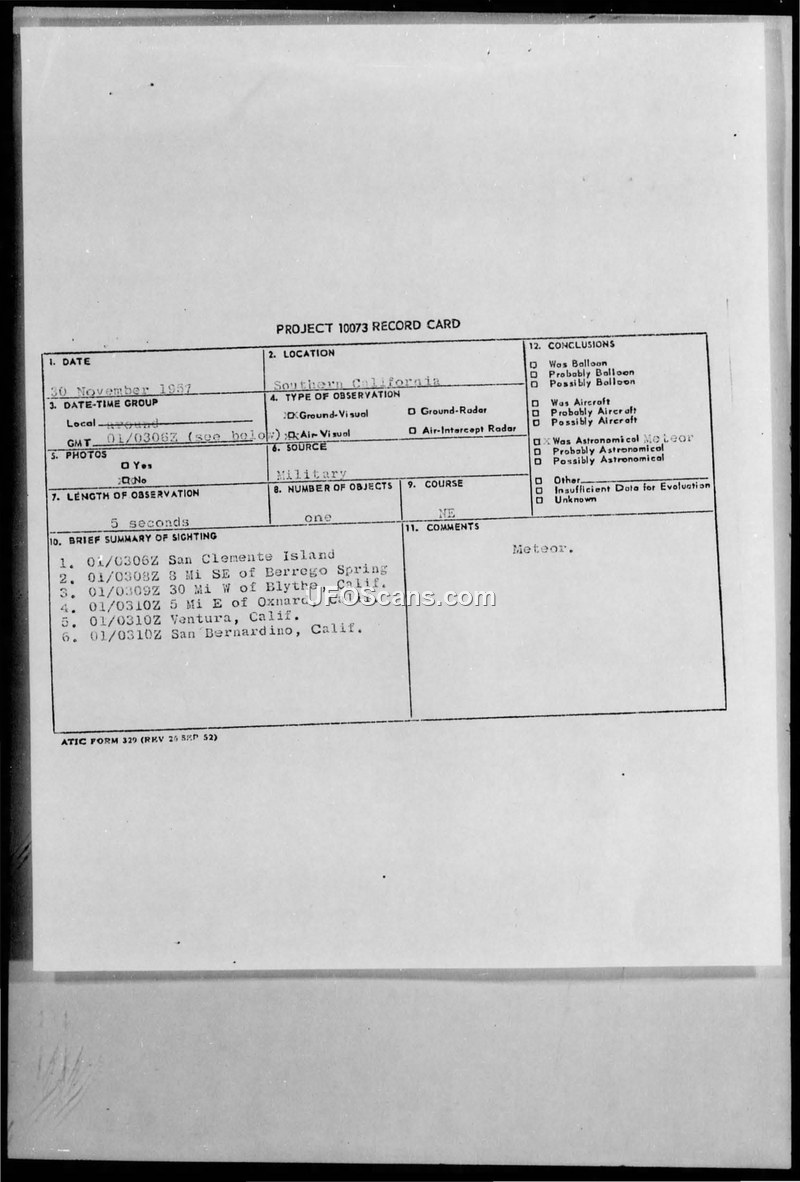 Multiple reports of a large object seen over Southern California on November 30, 1957, were evaluated by the 27th Air Division and ATIC as likely being a large meteor or meteorite.
